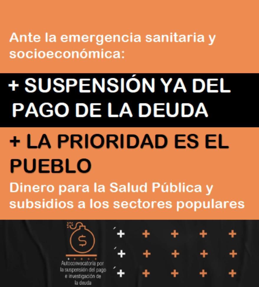 Las organizaciones, movimientos y personas nucleadas en la Autoconvocatoria por la Suspensión del Pago e Investigación de la Deuda, que aglutina a centenares de organizaciones y referentes de una gran diversidad de sectores y pensamientos, hemos tomado conocimiento de la decisión de su gobierno de aplazar hasta el próximo año, los pagos sobre la parte de la deuda pública emitida en dólares bajo ley nacional, un monto de aproximadamente USD 8.400 millones.