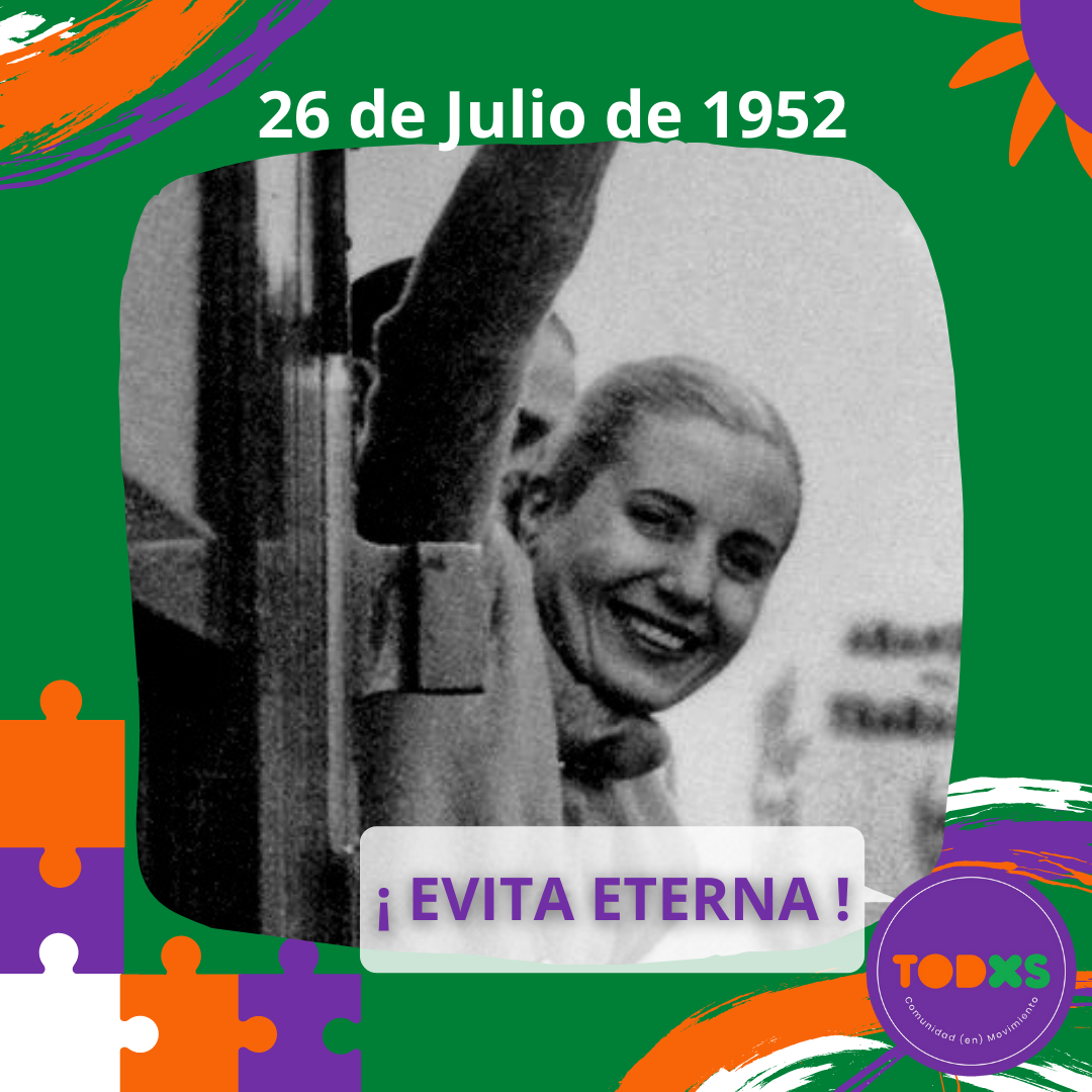 «Ha llegado la hora de la mujer que comparte una causa pública y ha muerto la hora de la mujer como valor inerte y numérico dentro de la sociedad. Ha llegado la hora de la mujer que piensa, juzga, rechaza o acepta, y ha muerto la hora de la mujer que asiste, atada e impotente, a la caprichosa elaboración política de los destinos de su país, que es, en definitiva, el destino de su hogar», dijo Evita y sus palabras resuenan, hoy más que nunca en la lucha colectiva que tantxs damos a diario en los barrios, las casas, las calles, las escuelas, las universidades para que las mujeres y disidencias sexogenéricas, sujetxs de derecho, seamos realmente protagonistas de nuestra propia liberación, de nuestra propia historia.