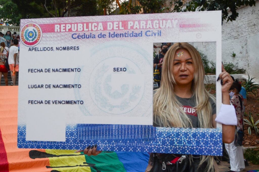 Pamela Montserrat marcha junto con su pareja con un cartel que dice: “Mi identidad es real, tiene que ser legal”. Se manifiestan por una identidad de género reconocida por la sociedad y el Estado. Ambxs son activistas de Diversxs de Alto Paraná. «Si no reconocen mi identidad no puedo trabajar y si no puedo trabajar, nos quedamos en este círculo de la exclusión», dijo Pamela. Alma Rolandi, activista de Sununu, del movimiento estudiantil FACSO-UNA, también lleva un cartel, pero con una foto de Chana Coronel, vocera de los derechos a las visitas íntimas de lesbianas privadas de libertad.