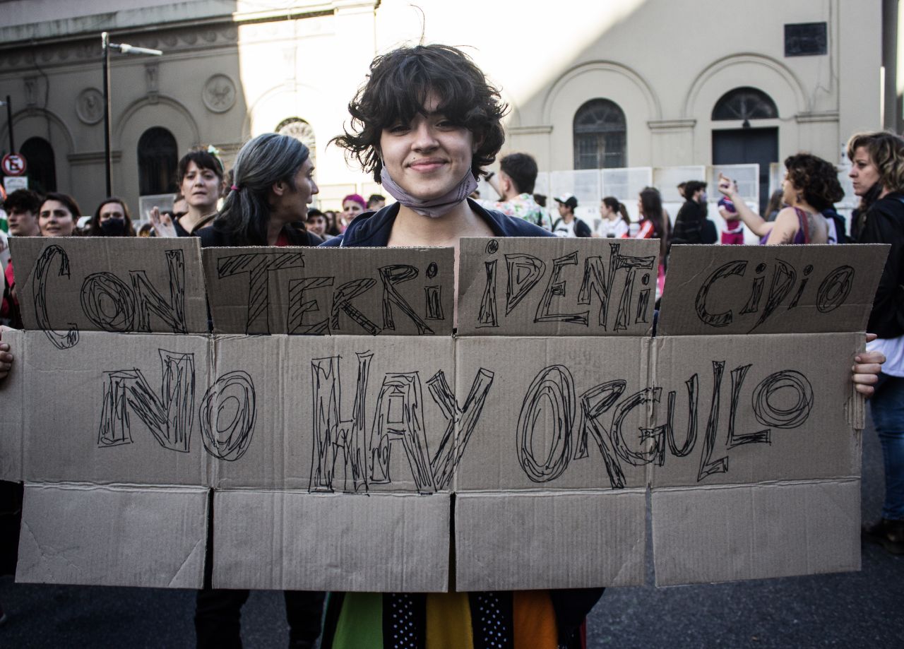 «Este gobierno que se nombra a favor de nuestros derechos tiene como candidata a Tolosa Paz que le achacó al macrismo no haber construido cárceles suficientes, y su propuesta es diez nuevas cárceles con presupuesto ya asignado, cuando las cárceles ya están superpobladas, cuando hay un récord de presupuestos mas bajos para educación. No es casual que estén de gira por Europa como locos para conseguir un acuerdo más beneficioso con el FMI, porque vas a construir mas cárceles cuando hay cada vez un índice más alto de pobreza, y quienes van a parar ahí, cis heterosexual, población trans y travesti; de la cual el 80 % está privada de su libertad por causas en relación a la ley de drogas, el 70 % son personas migrantes. La población mas vulnerada, la que peor recibe esta avanzada de represión de este gobierno que se supone que es menos de derecha y más progresivo».