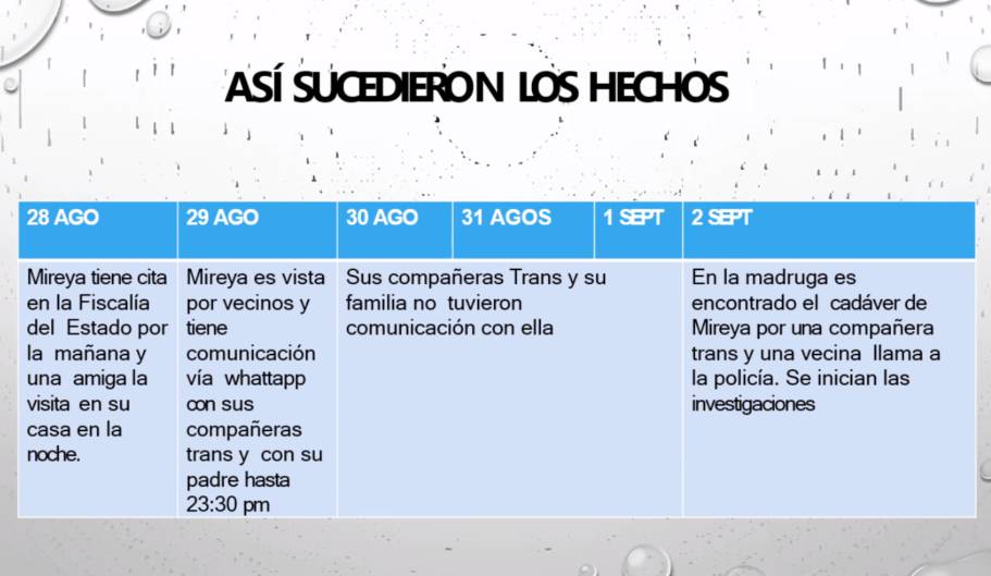 Además de ser el primer caso en que se reconoció, al menos desde la Fiscalía, la identidad de género de Mireya ante la Justicia, para la abogada “es un caso paradigmático”. También fue la primera vez se catalogó como testigas protegidas a mujeres trans que brindaron sus testimonios durante las investigaciones. Y porque el padre de Mireya permanece presente en el pedido de justicia por el transfeminicidio de su hija; algo que la activista Mayte Gardea considera inusual.