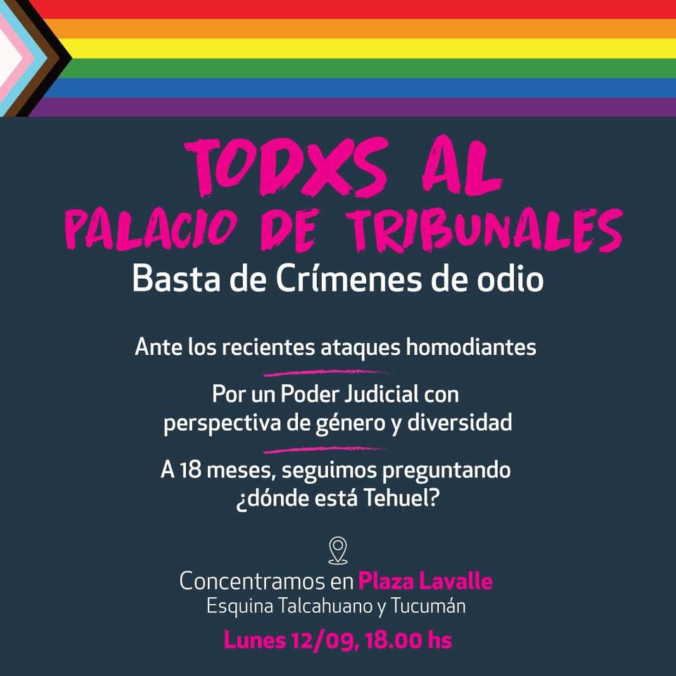 En tanto, bajo el lema «¡Basta de Crímenes de Odio!», otros sectores de la comunidad LGBTQI+ convocan a las 18 a movilizar al Palacio de Tribunales para exigir la aparición de Tehuel de la Torre a 18 meses de su desaparición y justicia por una serie de ataques homodiantes registradas en las últimas semanas, la detención de los agresores y una reforma judicial con perspectiva de género y diversidades. Entre quienes convocan se encuentra el actor y director Pablo D’Elia, quien acordó una cita con dos personas por la aplicación Grindr que luego intentaron drogarlo y ahorcarlo en su casa, y cuya causa quedó caratulada como intento de robo y lesiones leves. Los dos agresores ya han sido denunciados en otros casos.