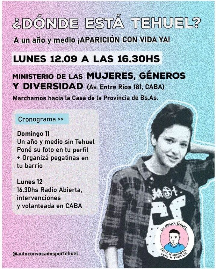 Ya este domingo 11, al cumplirse un año de la desaparición forzada del joven trans Tehuel de La Torre, Autoconvocadxs por Tehuel había convocado a poner su foto en los perfiles de las redes sociales y a organizar pegatinas en los barrios. Hoy, para continuar con la campaña por su aparición con vida, convocan a una radio abierta, intervenciones y volanteada desde las 16.30 frente a la sede del Ministerio de Mujeres, Géneros y Diversidad (ubicado en Avenida Entre Ríos 181), a cargo de Elizabeth Gómez Alcorta, para luego movilizar a la Casa de la Provincia de Buenos Aires (Callao 237).