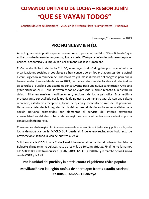 Pero mañana se espera protestas en las regiones del sur del país; Arequipa, Apurímac, Cusco, Puno, Moquegua. La decisión de retormar con fuerza las protestas habrían surgido en asamblea. En esta primera reunión se acordó preparar la ‘Marcha de los 4 suyos’ hacia la capital para exigir la renuncia de Boluarte y la condena por los asesinatos, cierre del Congreso y por una Asamblea Constituyente, entre otras. Hoy también se informó que El Comando Unitario de Lucha (CUL) «Que se vayan todos» de la región Junín se une al paro convocado para este miércoles 4 de enero con la demanda de la renuncia de la presidenta Dina Boluarte y de la Mesa Directiva del Congreso. También expresaron que las elecciones generales adelantadas sean este 2023, y no el 2024 como el Ejecutivo y el Congreso han acordado.