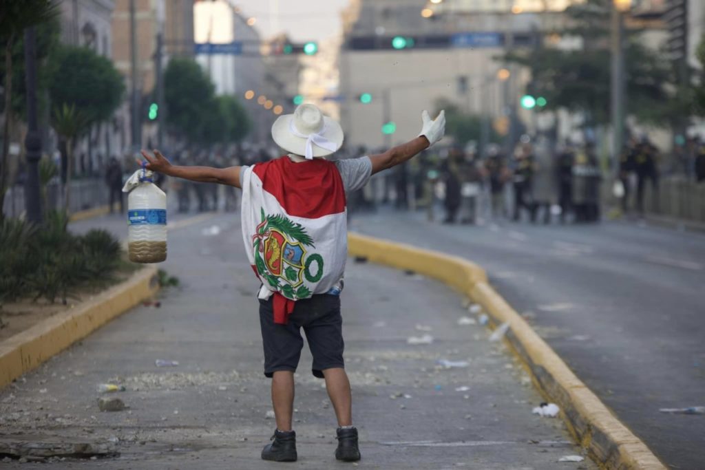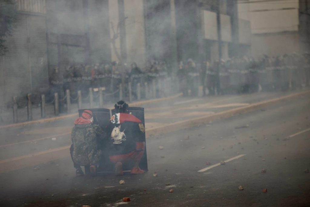 “Dina, asesina, mataste a nuestros hijos”, gritaba la multitud mientras arreciaba la represión. “La sangre derramada, jamás será olvidada”, era otra consigna que sonaba fuerte. “Somos campesinas, no terroristas”, coreaba un grupo de mujeres vestidas con coloridas y anchas faldas andinas. Poco más allá, un grupo de jóvenes las siguió: “Somos estudiantes, no terroristas”. Era la respuesta al gobierno, a la derecha y a los medios, que los acusan de terroristas. “Amigo, estudia, no seas policía”, se coreaba frente a los efectivos policiales. “Métele un balazo”, se escuchó gritar a un policía. “Asesinos, asesinos” respondía la gente, entre gases y ruidos de los disparos de perdigones. La exigencia de renuncia de la presidenta no cesaba. Fue el sexto día de protestas consecutivas en Lima. Una vez más, la respuesta del gobierno fue la represión.