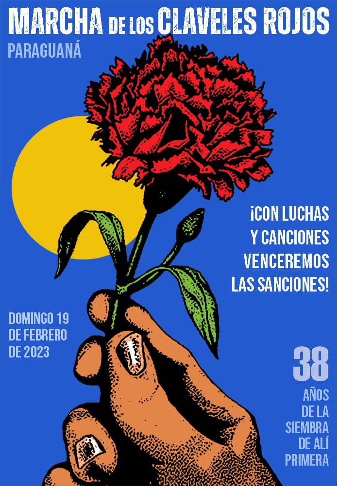 Por eso, este Domingo 19 de febrero, iremos todos a la *»Marcha de los claveles rojos»* marcharemos unidos, con alegría y con firmeza bolivariana, y en una voz, alzaremos la consigna» Con luchas y Canciones, venceremos a las Sanciones».