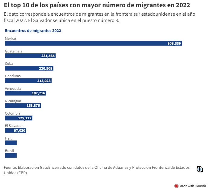Los datos de la CBP ubican a El Salvador en el puesto número ocho de países con más encuentros migratorios en la frontera sur estadounidense en el año fiscal 2022; y aunque en los primeros meses del año fiscal 2023, el país está en el puesto 11, los datos indican que la baja en el número de encuentros migratorios es generalizada e incluso mayor en Honduras y Guatemala.