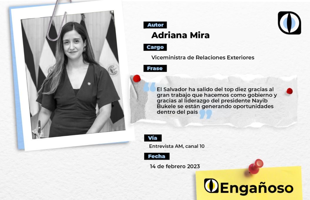 La viceministra de Relaciones Exteriores de El Salvador, Adriana Mira, dijo el pasado 14 de febrero, en la entrevista “AM” del estatal canal 10, que El Salvador había salido del listado de los diez países con mayor migración irregular hacia Estados Unidos. Un hecho que se debe, según la funcionaria, a que “se están generando oportunidades en el país”.