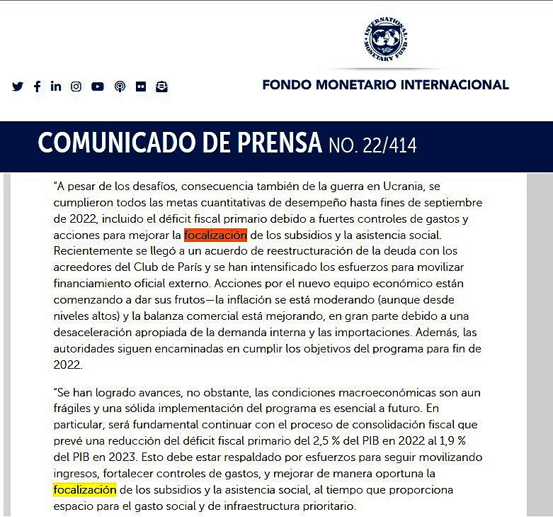 Este reconocimiento fue acompañado de un nuevo pedido para emular tal medida en la búsqueda de achicar el déficit fiscal: “(…) En particular, será fundamental continuar con el proceso de consolidación fiscal que prevé una reducción del déficit fiscal primario del 2,5 % del PIB en 2022 al 1,9 % del PIB en 2023. Esto debe estar respaldado por esfuerzos para seguir movilizando ingresos, fortalecer controles de gastos, y mejorar de manera oportuna la focalización de los subsidios y la asistencia social, al tiempo que proporciona espacio para el gasto social y de infraestructura prioritario”.