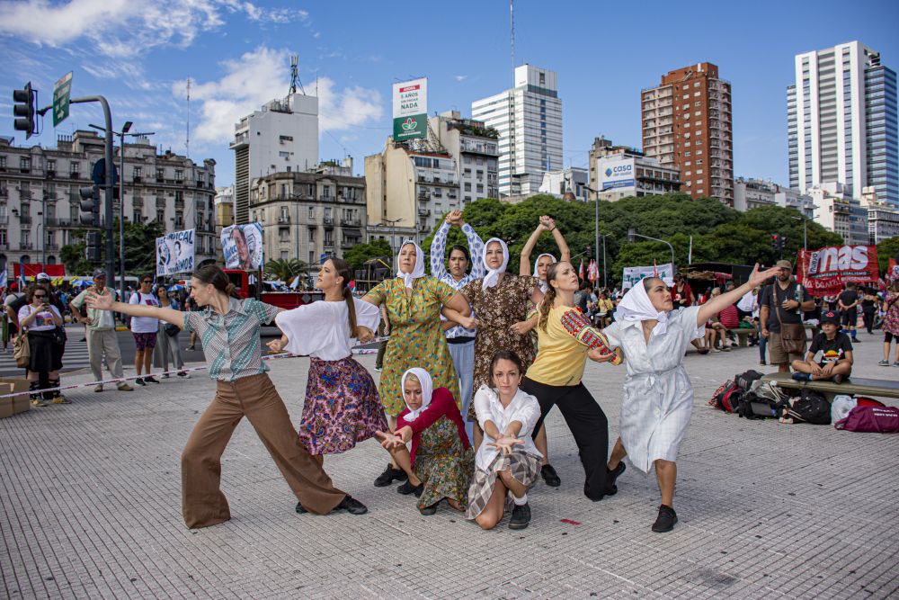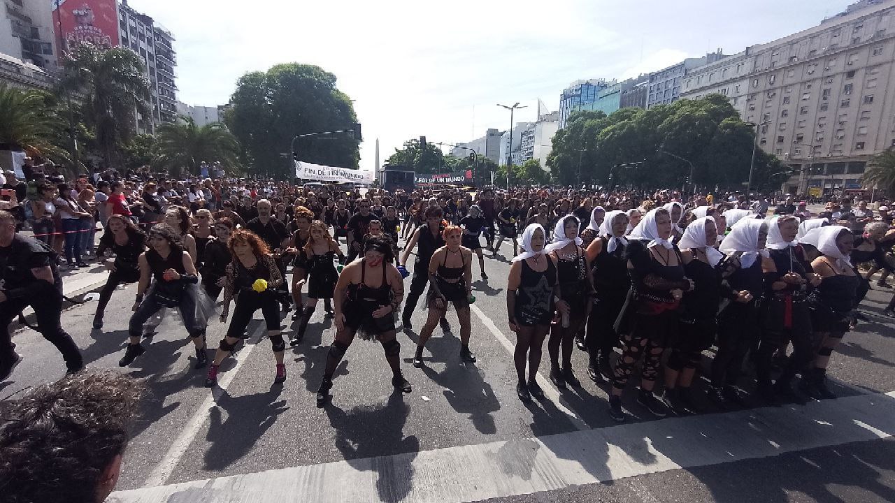 El Colectivo Fin de un Mundo realizó una performance en Avenida de Mayo y 9 de Julio. Fue una entre muchas otras actividades culturales que acompañaron la jornada.