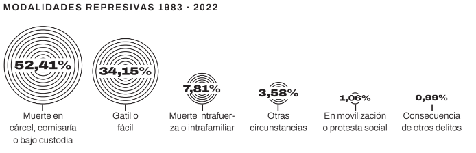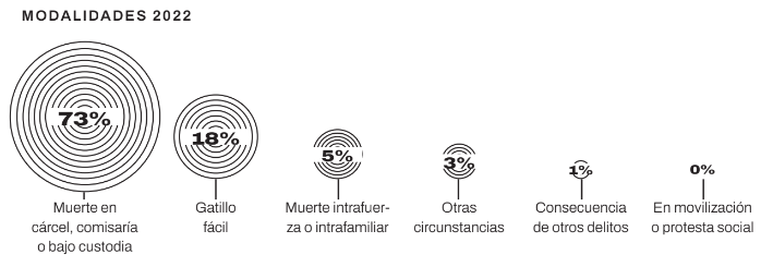 De las 436 muertes durante 2022, 319 ocurrie­ron bajo custodia; 80 fueron fusilamientos de gatillo fácil; 20 responden a contextos de violencia intrafamiliar (19 femicidios –incluida una desaparición- y un femicidio relacionado); 4 fueron consecuencia de otros delitos policiales (entre ellos, dos desaparecidos) y 13 a otras circunstan­cias (incluida una desaparición).