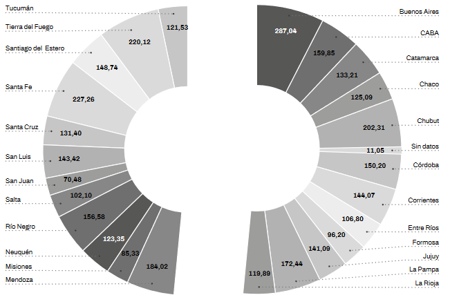 Si bien la provincia de Buenos Aires lidera el listado de mayores muertes en manos del Estado, el índice por millón de habitantes muestra que la represión se descarga de manera muy uniforme en todo el territorio nacional. En muchos casos, las mínimas diferencias entre los distritos responden a la falta de suficiente información confiable. De esta forma, Buenos Aires continúa primera, pero con poca diferencia respecto a las que siguen: Santa Fe, Chubut, Mendoza, La Pampa y CABA. Córdoba se ubica en el puesto número nueve.