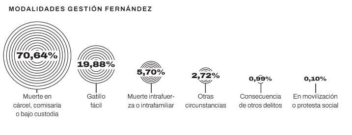 Veinte años atrás, la diferencia a favor de esta modalidad era muy inferior y estaba casi a la par del gatillo fácil. A lo largo del tiempo, el número se fue ampliando y tuvo un fuerte incremento a partir de 2020. En los tres años de gobierno del Frente de Todos, la brecha es de 1.066 muertes bajo cus­todia contra 300 fusilamientos por gatillo fácil.