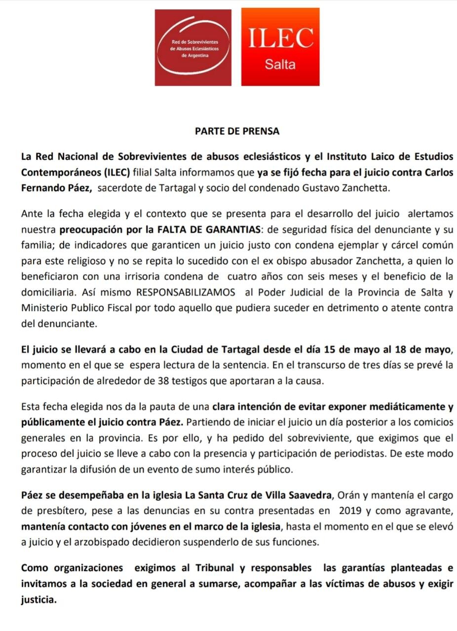 El juicio al cura Carlos Fernando Páez, acusado por abuso sexual en perjuicio de un exseminarista, comenzará el próximo 15 de mayo en Tartagal. En este contexto, el Instituto Laico de Estudios Contemporáneos de Argentina (ILEC), junto al denunciante, exigieron medidas de protección para él y su familia.