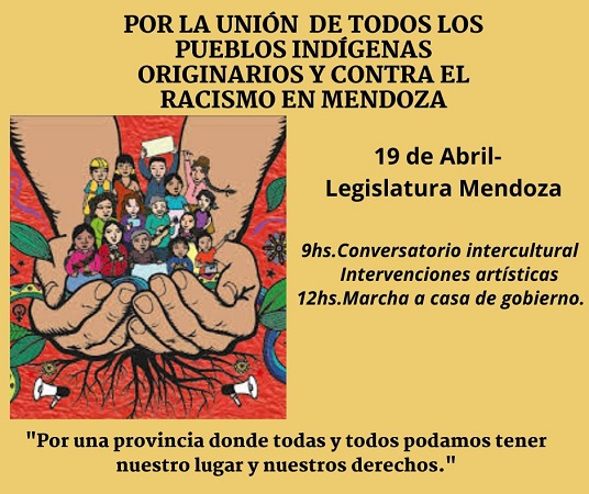 «Frente al accionar RACISTA de los diputados de Mendoza, del Poder Ejecutivo de Mendoza y una parte de la Justicia Provincial y federal en Mendoza; los Pueblos organizados nos expresamos en las calles para detener y revertir este RETROCESO DEMOCRÁTICO, para retomar el camino de la Reparación Histórica, en ejercicio de los Derechos Adquiridos de forma colectiva y en defensa de la Madre Tierra, los bienes naturales, el agua y los Territorios», convocaron desde la Coordinadora Antiracista de Mendoza.