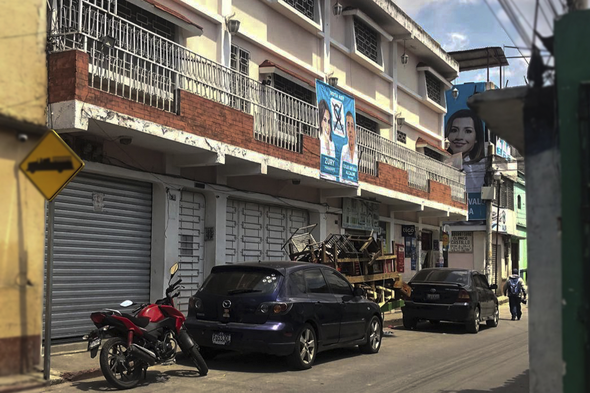 En uno de los edificios del centro de Totonicapán se puede observar una manta gigante de Edgar Arévalo, colgada desde el sexto nivel del edificio con su fotografía.