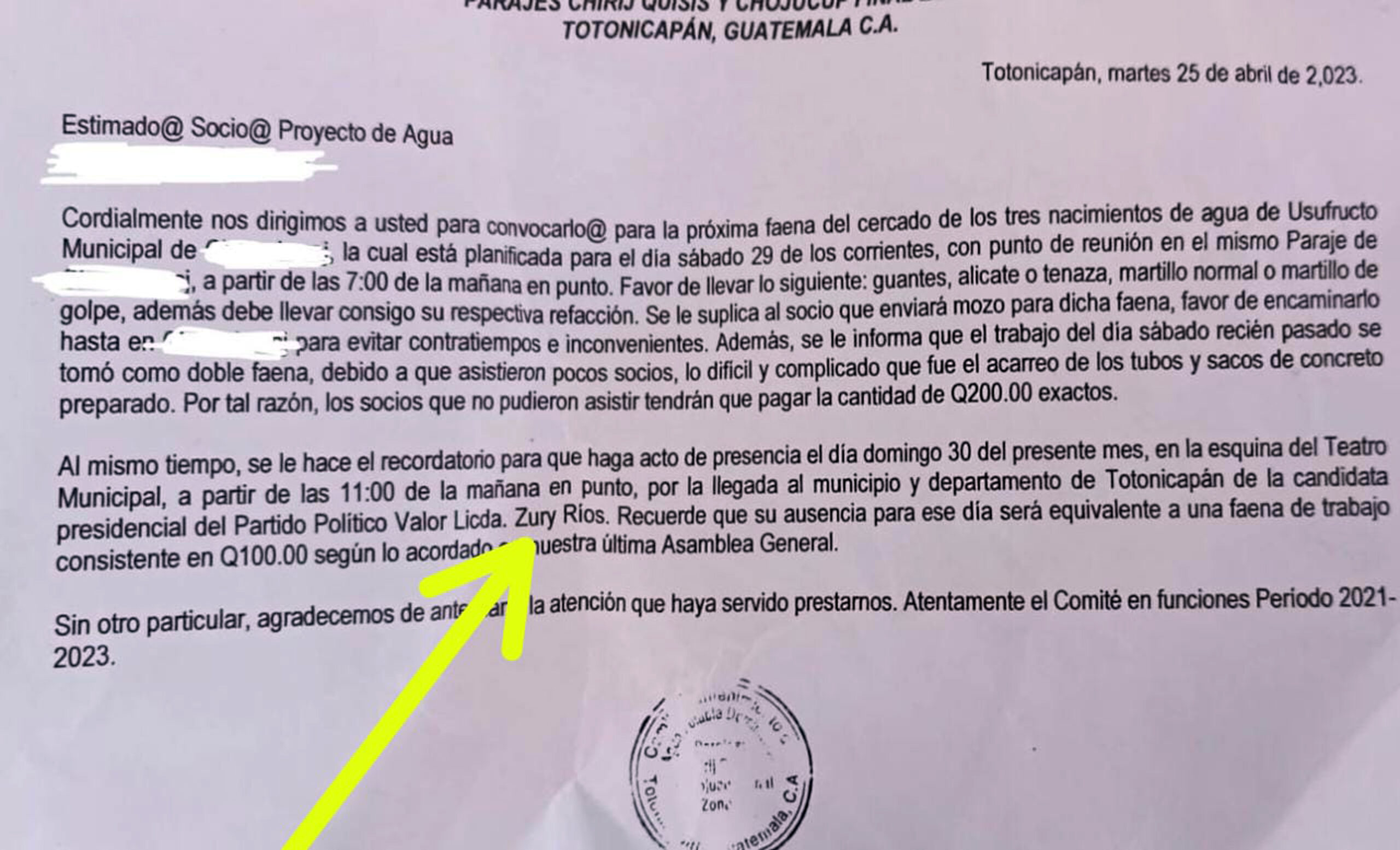 Las personas al frente del comité de agua en funciones de Chirij Quisis y Chojucup notificaron por escrito que, debido a que ellos solicitaron el sábado 15 de abril ayuda al partido político Valor, los beneficiarios del proyecto de agua debían de participar en el mitin convocado este domingo. De no presentarse, recibirían una sanción de Q100 quetzales, decía la circular.