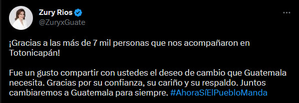 La candidata presidencial, visitó el occidente del país durante el fin de semana, realizó campaña electoral en el municipio de Momostenago desde las primeras horas de la mañana del domingo, luego se trasladó al centro de Totonicapán. Un día antes, la candidata estuvo en Santa María Chiquimula y unas horas antes en la ciudad de Quetzaltenango.
