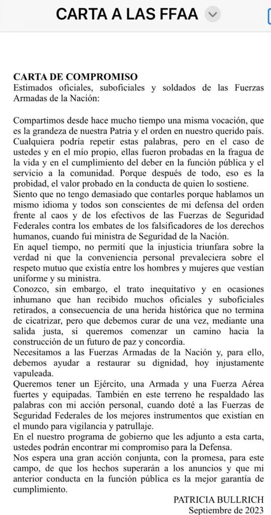 Una carta compromiso llegó la semana pasada a integrantes de las Fuerzas Armadas. En el texto, Bullrich promete una defensa corporativa como la tuvo mientras ejerció como ministra de Seguridad de Mauricio Macri. “Todos son conscientes de mi defensa del orden frente al caos y de los efectivos de las fuerzas de seguridad contra los embates falsificadores de los derechos humanos”, afirma Bullrich. No la explicita pero es una alusión a la denuncia por la desaparición y muerte de Santiago Maldonado, uno de sus caballitos de batalla.
