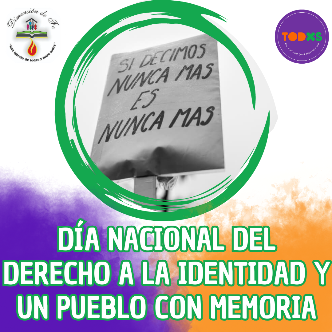 Como Iglesia Pentecostal Dimensión de Fe en IADLA, sabiéndonos pueblo, conmemoramos este 22 de octubre el Día Nacional del Derecho a la Identidad, defendiendo la lucha por los Derechos Humanos de Madres y Abuelas de Plaza de Mayo y de tantxs hermanxs y compañerxs, quienes seguimos luchando por la restitución de lxs nietxs apropiadxs durante la última dictadura argentina. Esta fecha coincidió además con la jornada de comicios presidenciales y provinciales en el país, siendo un símbolo mayor en la defensa de la democracia que tanta lucha nos ha costado.