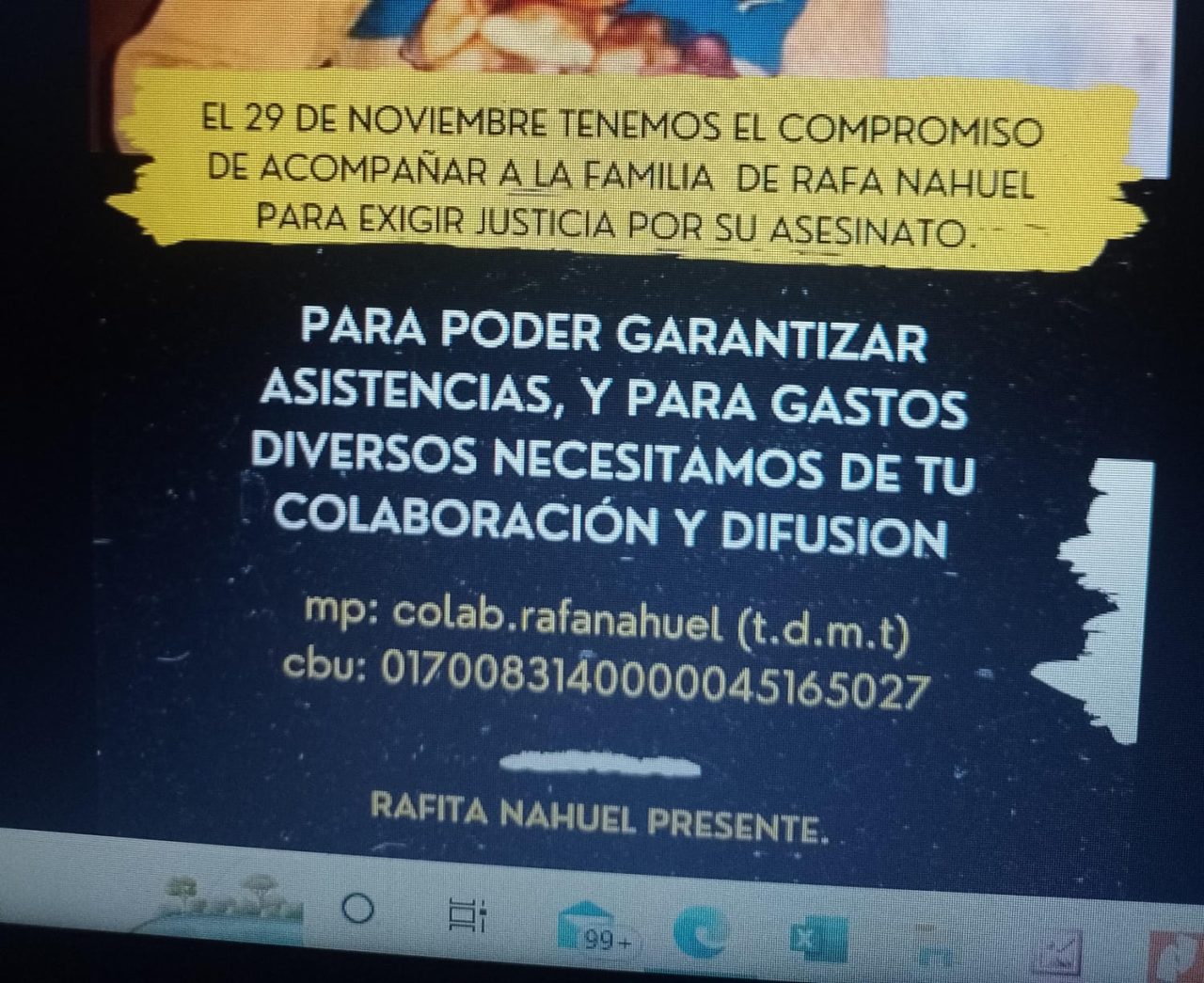 Pu lamgen y compas que están sosteniendo la movilización y el acompañamiento al Juicio por Rafael Nahuel en Fiske Menuko hacen el llamado a solidarizarse colaborando con un aporte económico, principalmente para garantizar que los testigos y miembros de las comunidades del pueblo Mapuche puedan llegar a esta última instancia de VEREDICTO.